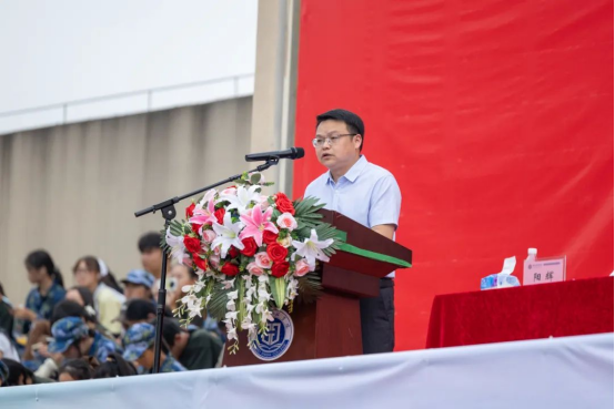 ▲學(xué)校黨委書記、軍訓(xùn)團(tuán)政委覃紅斌講話