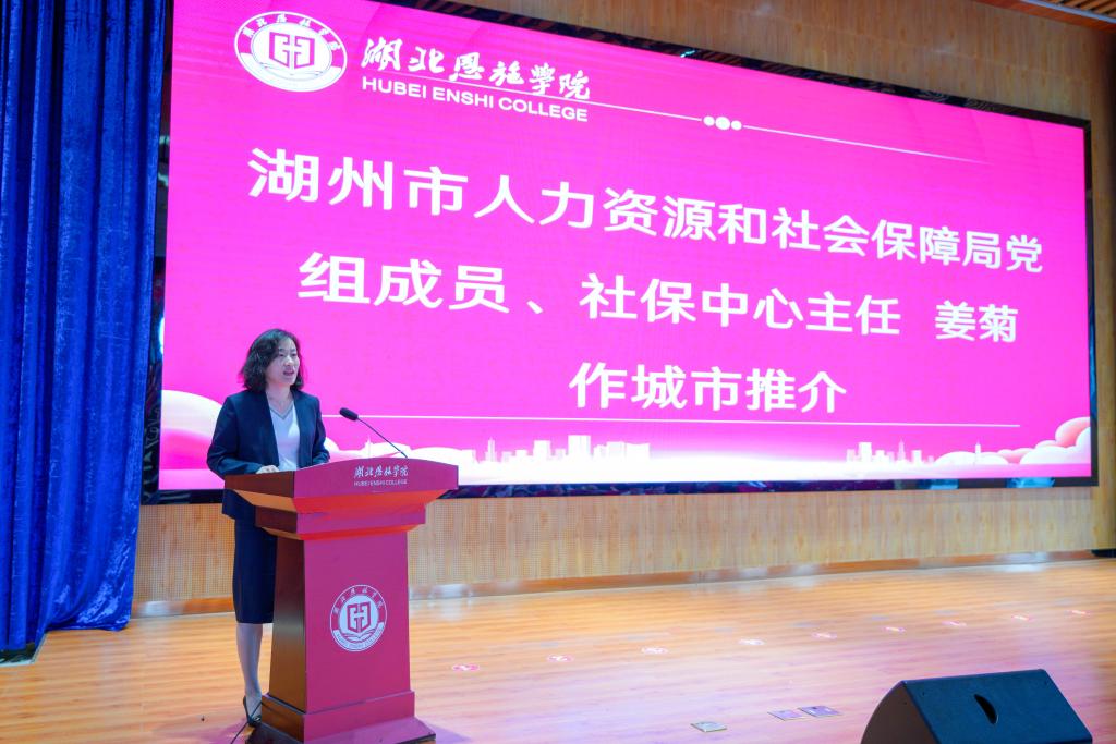 隨后,湖州市人力資源和社會保障局開展了城市及人才政策推介活動,湖州市人力資源與社會保障局主任姜菊詳細(xì)介紹了湖州市的就業(yè)創(chuàng)業(yè)優(yōu)勢、青年創(chuàng)業(yè)就業(yè)的優(yōu)惠政策和人才支持策略,并表示將盡全力為前往湖州就業(yè)的優(yōu)秀人才營造最優(yōu)環(huán)境、給予最大支持、提供最好服務(wù)。
