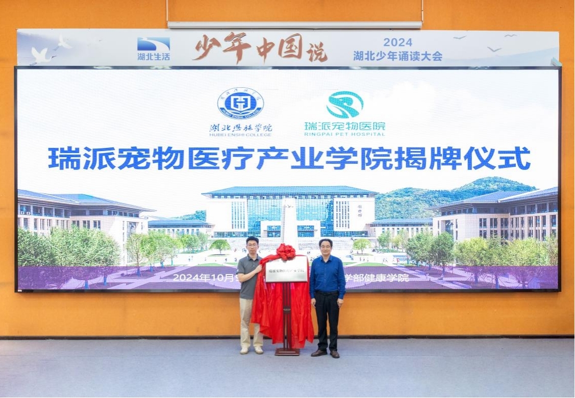 隨后,馬鳳余校長與丁立祥主管共同為湖北恩施學(xué)院瑞派寵物醫(yī)療產(chǎn)業(yè)學(xué)院揭牌。